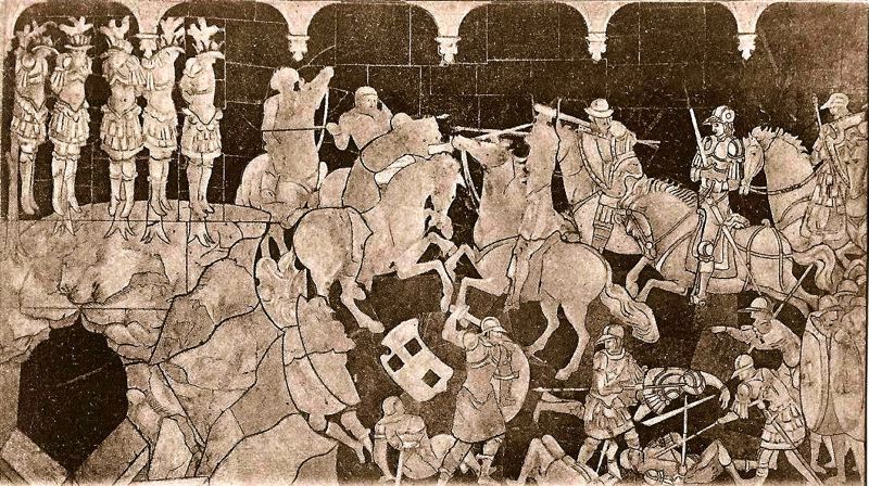 Il primo riquadro a sinistra mostra Giosuè che vince gli Amorrei tra le figure coeve di Salomone e Giosuè. La scena venne messa in opera nel 1426 da Paolo di Martino in base ai fogli disegnati dal Sassetta