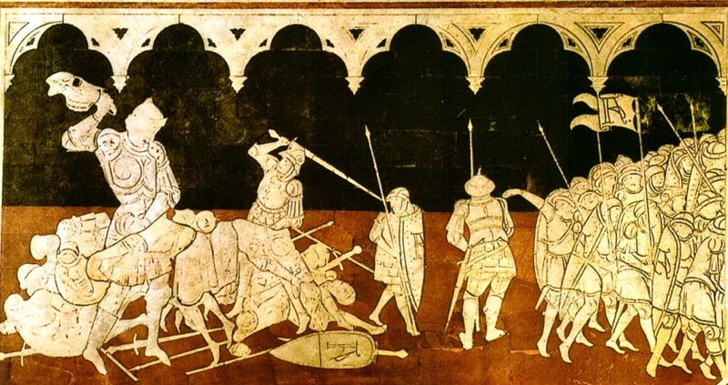 Sulla destra, la Storia di Sansone è fiancheggiata dalle figure di Mosè e di Giuda Maccabeo. La scena, attribuibile al Sassetta come l'altra scena simmetrica vicino al transetto sinistro, perchè analoga per tecnica e stile, è dominata dalla figura gigantesca di Sansone, che sta massacrando con una mascella d'asino in pugno i guerrieri filistei. uno lo regge col braccio, alcuni sono già esanimi a terra e altri fuggono impauriti. Anche qui ricorre in alto il motivo degli archetti trilobati a tutto sesto.