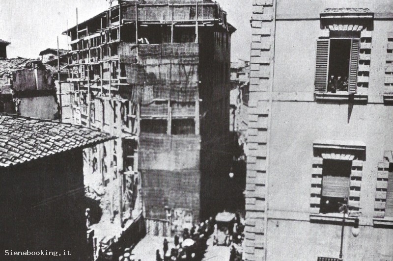 La datazione precisa della foto è connessa al riconoscimento della maccina in arrivo da via Montanini. Si tratta dell'auto del Re Vittorio Emanuele III dirtta in Piazza del Campo per l'inaugurazione della Mostra dell'Antica Arte Senese, allestita all'interno del Palazzo Pubblico.