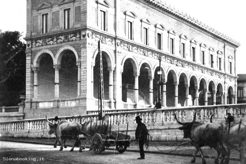Infatti, mentre su via Tozzi transitano carri da traporto trainati da buoi maremmani, sul maciapiede si nota chiaramente un traliccio di sostegno della rete aerea a supporto deli Filobus che a quel tempo circolavano a Siena: da Fotebecci a Valli.