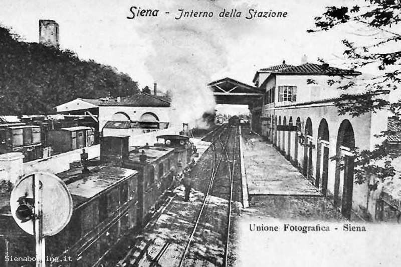 Cartolina fotografica ritagliata e restaurata, dove si vede la vecchia Stazione Ferroviaria con un treno in manovra.