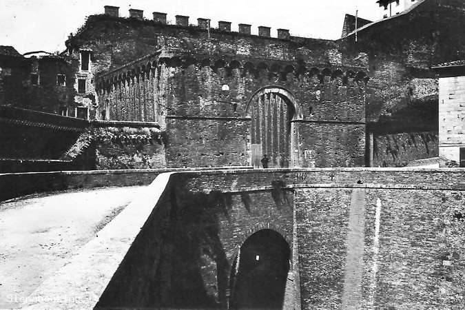 Vista ravvicinata del quadrivio fuori Porta Ovile con tutte le strade in terra battuta imbrecciata.