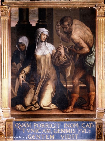 Si tratta di una delle tre grandi scene presenti nell'oratorio della cucina del Santuario di santa Caterina, una parete ospita ai lati due dipinti eseguiti dal Riccio poco prima della sua morte e forse completati da Arcangelo Salimbeni. Quello di destra presenta Caterina che offre il mantello a Gesù sotto le sembianze di un pellegrino. L'opera fa parte degli eventi miracolosi che costellarono la vita di Caterina e sono testimonianza del suo straordinario spirito caritativo.