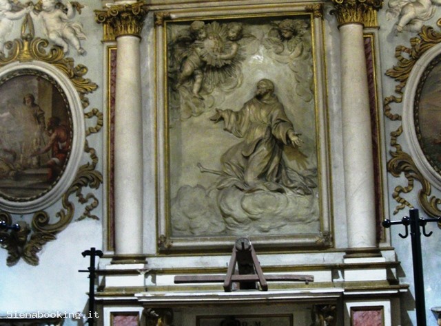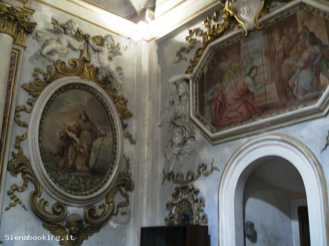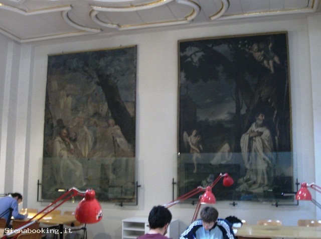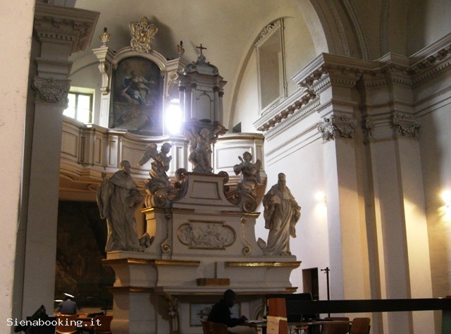 L’ex chiesa di Santa Mustiola nasce nel Quattrocento come chiesa del convento dei Camaldolesi che già esisteva da tre secoli. La grande chiesa fu restaurata nel Settecento in stile barocco e, mentre il convento fu soppresso nel 1810 dalle truppe francesi di Napoleone, la chiesa fu sconsacrata 170 anni dopo. Da allora fu adibita ad auditorium ed a sala congressi. Solo da pochi anni, poi, è la Biblioteca Centrale della Facoltà di Scienze Matematiche, Fisiche e Naturali dell'Università degli Studi di Siena. La grande chiesa a navata unica con transetto all’esterno è priva di decorazione: la facciata ha soltanto un finestrone rettangolare che dà luce all’interno. Della struttura quattrocentesca sono visibili il transetto sinistro ed il bel campanile a vela in cotto con tre finestre ogivali per le campane. La ricca decorazione plastica in stucco dell’interno a navata unica con transetto ed abside quadrata ricorda la decorazione di molte altre chiese senesi. Lungo la navata centrale ci sono quattro altari laterali, contenenti varie pale settecentesche. L’altar maggiore, opera dello scultore Bartolomeo Mazzuoli, è dominato dalla pala “San Romualdo”.