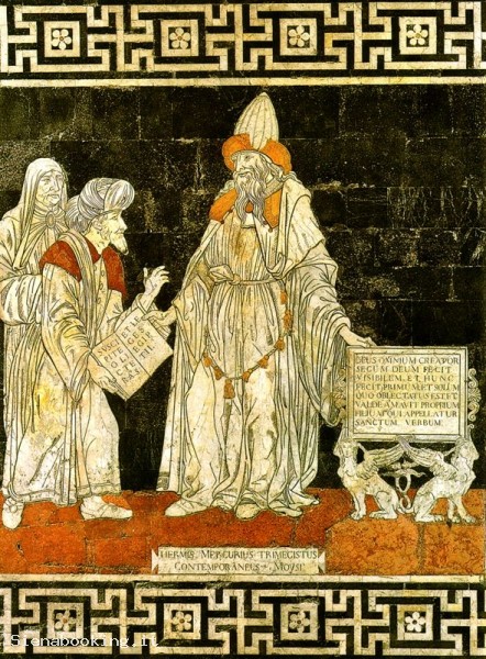 The first scene in front of the main entrance, where there is also the inscription "castissimum virginis templus caste ingredi memento", depicts Hermes Mercury Trismegistus, Egyptian scholar who is remembered as the depositary of the entire ancient wisdom, and knowledge of the earthly symbol of the beginning . How do you explain the scroll at his feet was considered a contemporary of Moses: Hermis Mercurius Trismegistus contemporaneus moysi. It is represented as an Eastern sage shown in the act of offering two other men with his right hand a book, while his left hand is supported by a quote written on a tombstone supported by two winged sphinxes. The two men, who commit an act of deference, it may perhaps typings of the sages of the East and West. The table reads deus amnium creator secum Deum et fecit visibilem hunc fuit primum et solum quo oblectatus east et valde amavit proprium filium here appellatur verbum sanctum. This is an allusion to the creation, carried out by the "Verbum sanctum." On the pages of the book it is printed: suscipite or licteras et legis egiptii, a reference to Egypt as the site of ancient wisdom, alluded to probably the two sphinxes. The design of the work, dated 1488, is attributed to Giovanni di Stefano, based on analogies with the Cumaean Sibyl.
