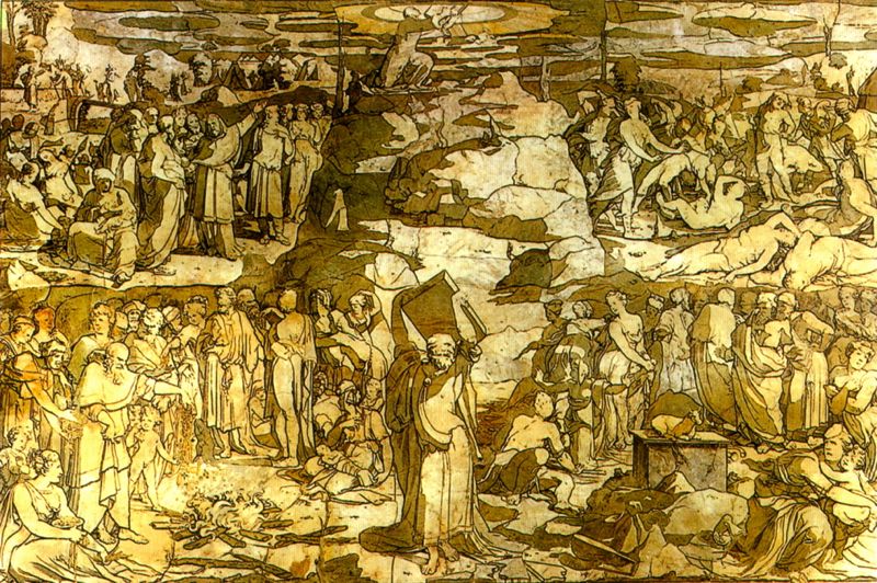 Bottom center, Moses raises his boards over his head for scgliarle sending her to the ground in pieces. Meanwhile in fact the people of Israel disobeyed him because the elders of Israel, in the top left, trying to convince Aaron to give Israel a new divinity. This is done in the lower register, where the Israelites left spilling gold and jewels on the fire forging the golden calf that you see to the right, the people here loves it, angering Moses is just down from the mountain where he had the divine revelation . Top sinners are points with the plague, dying spasms (Exodus 32, 27-28).