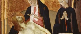 The table is characterized by the decidedly unusual subject and iconography that make the painting a sort of ex voto: the pale and lifeless body of Christ is lying on the knees of the Virgin who, with a painful gesture, mourns the passion and death of the Son to whose martyrdom the great cross alludes, the scourge hanging on the nail, the spear and the cane with the sponge with which the Roman soldiers gave vinegar to the dying Christ. Kneeling next to the Virgin, hands folded in prayer, is the commissioner of the work to which the two coats of arms painted at the base of the table refer, whose identification has allowed to recognize in the elderly gentleman the figure of Peter Volckammer, rich citizen of Nuremberg arrived in Siena following the emperor Sigismund and died here on 5 September 1432. Behind him is San Sinibaldo who, as patron saint of the Germanic city, holds a symbolic model of Nuremberg in his hand. Kneeling next to the Virgin, hands folded in prayer, is the commissioner of the work to which the two coats of arms painted at the base of the table refer, whose identification has allowed to recognize in the elderly gentleman the figure of Peter Volckammer, rich citizen of Nuremberg arrived in Siena following the emperor Sigismund and died here on 5 September 1432. Behind him is San Sinibaldo who, as patron saint of the Germanic city, holds a symbolic model of Nuremberg in his hand. The painting was probably executed shortly after the death of the rich personage, whose body was buried in the Sienese cathedral: the two crests of the Volckammer coat of arms are in fact devoid of the golden crown which the family had the right to bear their insignia from November of 1433.The panel was recognized by critics as one of the oldest works of the Sienese artist known as the 'Maestro dell'Osservanza'. The expression absorbed, vaguely dazed by the glances, the clear design of the profiles and the preference for a painting with enameled tones seem to prelude the solutions of Sano di Pietro whose activity, according to some scholars, the paintings belonging to the group 'Maestro dell'Osservanza 'would even constitute the oldest manifestation.