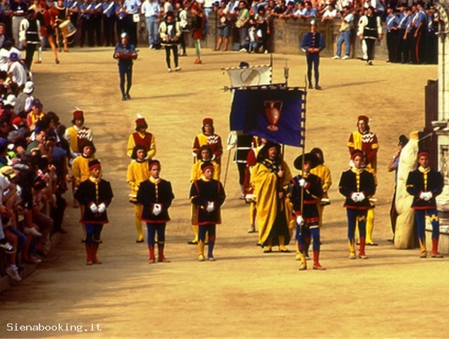 In ricordo della memorabile battaglia di Montaperti (1260) e dello scampato pericolo, i senesi decisero di indire il famoso Palio, ritenuto oggi da molti la manifestazione e festa storica più importante e rinomata d'Italia. La storia del Palio di Siena è però più articolata e complessa, e affonda le proprie radici in un'epoca ancor più remota. Nelle città italiane del XII e XIII secolo era usanza organizzare corse di cavalli, sia come spettacolo pubblico, sia come competizione tra i diversi allevamenti equini posseduti dai nobili cittadini e non. Parallelamente ai palii dei nobili, i cittadini di Siena cominciarono ad organizzare, più o meno spontaneamente, altre competizioni nei modi più disparati. L'organizzazione su base rionale della Festa e delle comunità trova la sua origine, nel tipo di organizzazione territoriale delle compagnie militari che caratterizzava l'esercito senese medievale. Quando non c'era la guerra, questa organizzazione si riversava nella competizione. La corsa del Palio prende il nome dal premio: il Palio, dal latino pallium (mantello di lana), era in genere un drappo di stoffa molto pregiata che veniva utilizzato per gli scopi più svariati. A Siena, in genere, era destinato alla chiesa del rione vincitore. Poteva essere utilizzato sia come arredo per la chiesa stessa. Questo avveniva perché, ai loro albori, le Contrade si appoggiavano per le loro riunioni alle Parrocchie o alle compagnie laicali che sostenevano e supportavano gli ordini monastici. È comprensibile come, in caso di vittoria, il premio venisse regalato alla Chiesa del rione, sia per riconoscenza sia per devozione. È dal Settecento che si afferma l’idea del Palio-dipinto e solo dopo la Seconda guerra mondiale che a dipingerlo vengono chiamati non più i bravissimi artigiani senesi ma pittori di fama nazionale e internazionale.