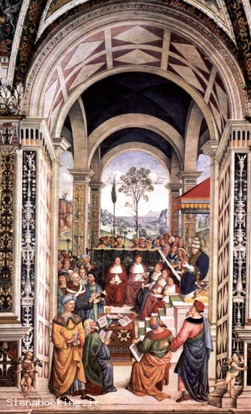 The scene is structured in such a way quite unusual. In fact, if the porch that lets you see the landscape belongs to the Umbrian tradition inaugurated by Perugino and the throne is also present in other scenes of the Library, the original is the part of a curtain that separates the group of cardinals from the large group of onlookers.