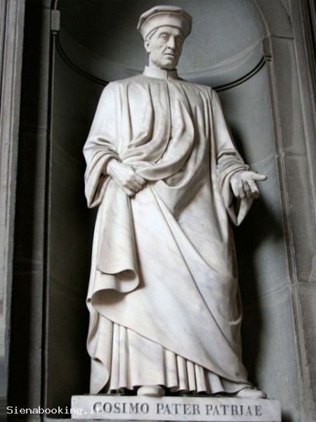Partendo da sinistra, la prima figura inserita è proprio quella di Cosimo Pater Patriae, allocata assieme alle altre durante il granducato lorenese.