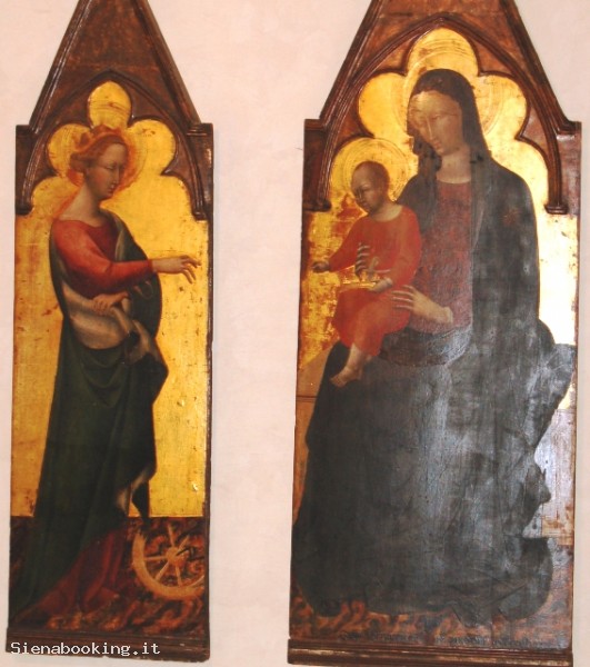 Due pannelli cuspidali facenti parte di un grande polittico smembrato e raffiguranti, rispettivamene di santa Caterina d'Alessandria nel pannello più piccolo e la Madonna in trono col Bambino, nell'altro.