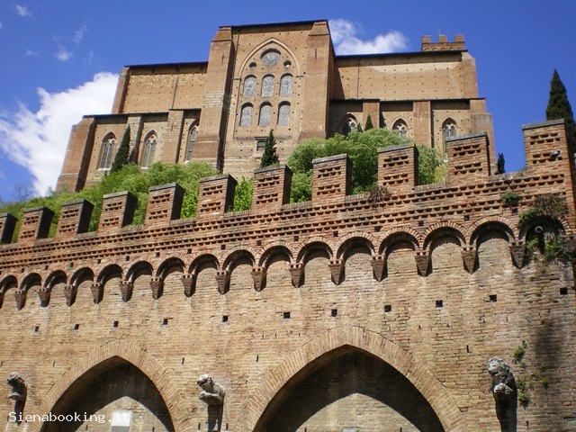 La Basilica di San Domenico è una delle più importanti chiese di Siena e si trova in Via Camporegio. La chiesa fu innalzata nel 1226-1265, ma nel corso del Trecento il complesso fu ampliato nelle forme gotiche che vediamo ancora oggi. La vasta architettura in mattoni tipica degli ordini mendicanti mostra sulla sinistra il campanile sbassato nel 1798 in seguito al sisma e presenta una pianta a croce egizia con amplissima navata, coperta a capriate e transetto con alte cappelle. L'ingresso si trova all'inizio del fianco sinistro della chiesa, in quanto la facciata è occupata dalla struttura sopraelevata della cappella delle Volte, quest'ultima è un antico luogo di preghiera delle Terziarie Domenicane dette Mantellate e legato a numerosi episodi di santità di Caterina da Siena. Nella prima campata di quest'ambiente notiamo la Canonizzazione di Santa Caterina di Mattia Preti, affiancata da due dipinti firmati e datati 1602 da Crescenzio Gambarelli, autore pure, nella parete adiacente, della Morte della Santa e della Santa che recita l'uffizio con Cristo (1602), collocate ai lati dell'Apparizione di Caterina a Santa Rosa da Lima di Deifebo Burbarini. Sulla parete di fondo si staglia l'affresco di Andrea Vanni con Caterina e una devota, veritiero ritratto della santa. Negli altari della parete sinistra della navata si trovano la Madonna col Bambino di Francesco di Vannuccio, incorniciata da una tavola del Sodoma con l'Eterno e Santi e completata dalla predella con quindici Storie neotestamentarie riferite ad Antonio Magagna; il Sant'Antonio Abate che libera una indemoniata di Rutilio Manetti; lo Sposalizio mistico di Santa Caterina d'Alessandria di Sebastiano Folli; il San Giacinto che salva da un incendio una statua della Vergine e un ostensorio di Francesco Vanni. Nella parete destra della navata si trovano l'Apparizione della Vergine al Beato Gallerani di Stefano Volpi, la Natività della Vergine di Alessandro Casolani, e una teca contenente reliquie di Santa Caterina. Segue la cappella di Santa Caterina, voluta nel 1466 da Niccolò Bensi per custodire la reliquia della testa della santa, collocata al centro dell'altare di Giovanni di Stefano, ornato lateralmente da due affreschi del Sodoma. Completa la cappella il quattrocentesco pavimento marmoreo con la raffigurazione di Orfeo e gli animali, attribuito a Francesco di Giorgio. La parete destra della navata continua con un affresco staccato di Pietro Lorenzetti che rappresenta la Madonna col Bambino, San Giovanni Battista e un cavaliere e l'Adorazione dei pastori di Francesco di Giorgio, completata dalla lunetta di Matteo di Giovanni e dalla predella di Bernardino Fungai. Il transetto destro è ornato sul fondo dall'altare dedicato al Beato Ambrogio Sansedoni, raffigurato nella tela di Francesco Rustici collocata al centro. Il recente altare maggiore è abbellito dal ciborio e dai due angeli di Benedetto da Maiano mentre nell'abside sono collocate la Morte di San Pietro Martire di Arcangelo Salimbeni e San Tommaso di fronte al papa di Galgano Perpignani. Al complesso appartiene anche una gotica cripta, restaurata nel 1935, divisa da pilastri in tre navate voltate a crociera e absidate.