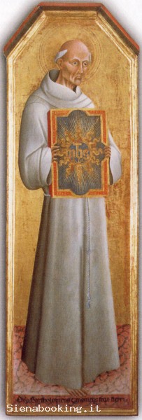 Panel painting with gold background. Depicted a St. Bernard with a slender and pained figure holding a tablet with the name of Jesus in his hand.