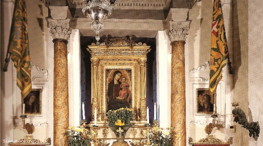 L’interno ha quattro campate delimitate da lesene doriche. Nelle due campate centrali, cornici in stucco a volute ospitano due tele dovute a Dionisio Montorselli (seconda metà XVIII sec.): quella di destra con l’Adorazione dei Magi e quella di sinistra con la Circoncisione. Più avanti, in altre due cornici centinate sono collocate due tele con San Bernardino e Santa Caterina da Siena, attribuite al pittore amiatino Giuseppe Nicola Nasini (inizio del secolo XVIII), pienamente barocche. All’altar maggiore, entro una cornice dorata, è esposta la tavola con la Madonna col Bambino, detta “della Disciplina Maggiore”, dovuta a Luca di Tommè (seconda metà XIV sec.), dove si scorgono ricordi stilistici di Simone Martini.