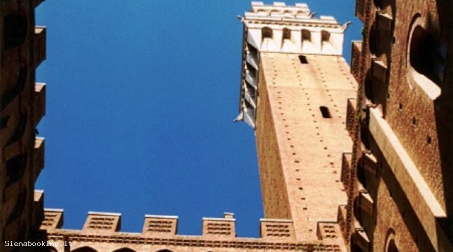 È così chiamata dal soprannome di "Mangiaguadagni" dato al suo primo custode Giovanni di Balduccio, famoso per apprezzare molto i piaceri del cibo e sperperare quindi a tavola i propri guadagni. È tra le torri antiche italiane più alte, arrivando a 102 metri compreso il parafulmini. Fu costruita tra il 1325 e il 1348. I quattro lati sono perfettamente orientati, a coppie, secondo le direzioni N-S ed E-O. La costruzione del corpo centrale fu affidata ai fratelli aretini Francesco e Muccio di Rinaldo, che probabilmente costruirono la parte in cotto e muratura mentre Agostino di Giovanni avrebbe realizzato la parte superiore in travertino bianco. L'orologio fu costruito nel 1360 da Bartolomeo Guidi. Nel 1428 il quadrante era dipinto e nel 1776 fu rifatto in pietra e ornato di un affresco coperto da una tettoia. Questi ultimi due elementi sono scomparsi con i restauri di inizio Novecento. Dopo svariati tentativi di fusione, la prima campana fu fusa nel 1348 e installata nel 1349 nella cella campanaria. Fu sostituita nel 1634 ma questa risultò imperfetta. Nel 1666 fu installata la campana attuale, chiamata dai senesi Sunto (per la dedica a Maria Assunta) o Campanone. Pesa 6.760 chili e a causa della sua mole venne stavolta installata sopra la cella campanaria, dove la vediamo oggi. Anche questa, però, non doveva essere fusa in modo perfetto, nonostante fosse stata fusa due volte, nell'anno precedente e, per migliorarne il suono, ne fu asportato un piccolo spicchio. Ancora oggi il suo suono non è uniforme e varia a seconda del punto in cui viene percossa dal batacchio. Essendo suonata in modo tradizionale solo nel giorno del Palio, il suo suono particolare viene associato dai senesi all'imminenza della festa. Fino al 1379 il custode della torre batteva anche le ore, ma in quell'anno venne sostituito da un automa ligneo che, in memoria del primo custode, fu chiamato "Mangia".
