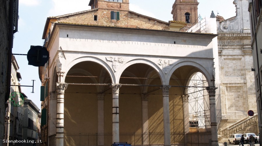 Le Logge vennero costruite per volontà dal ponteficie Pio II Piccolomini per farne dono alla sua famiglia che ancor oggi e sparsa in tutto il mondo. La Loggia fu ralizzata nel 1462 dall'architetto senese Antonio Federighi nelle tre eleganti arcate rinascimentali in travertino sorrette da colonne con capitelli corinzi.