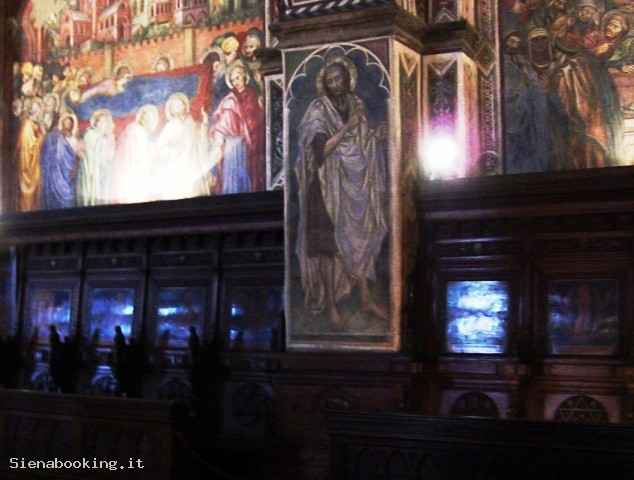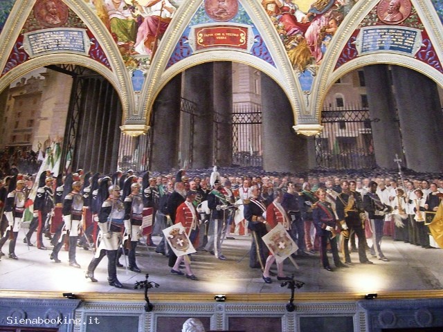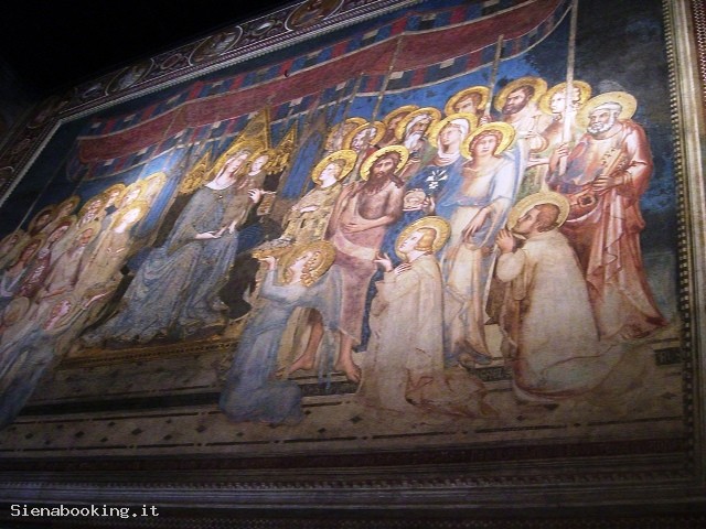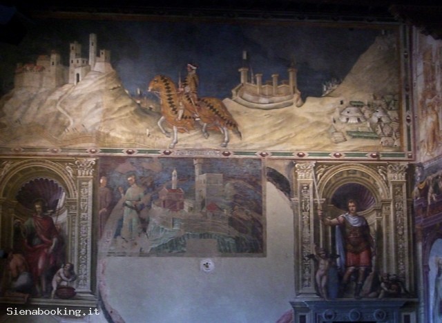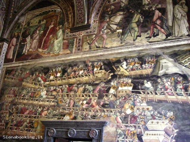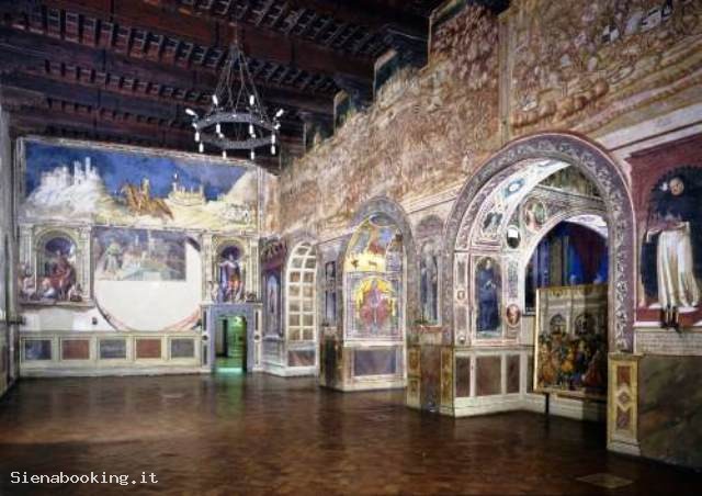 Dal cortile del Palazzo Pubblico si accede al Museo Civico, che conserva splendide opere di pittura e di scultura assieme ad affreschi di straordinario valore artistico e documentario della famosa scuola pittorica senese. Salite due rampe di scale si è davanti all’ingresso delle Sale monumentali, e volgendo subito a destra si entra nella Sala del Mappamondo, nucleo portante del palazzo, essendo stata a lungo destinata alle riunioni del Consiglio Generale della Repubblica. Il nome proviene da una perduta mappa rotante dipinta da Ambrogio Lorenzetti, che raffigurava l’antico territorio della Repubblica. Da questa sala prese avvio il programma decorativo del Palazzo, sulla parete di fondo è ospitato l’affresco di Simone Martini, la grandiosa “Maestà” del 1312-15, ancora ammirevole per la delicatezza degli accordi cromatici, per la purezza delle linee. E’ il primo capolavoro noto del pittore, che sulla parete di fondo effigiò vari anni dopo nel 1328 il ritratto del condottiero “Guidoriccio da Fogliano” conquistatore del Castello di Montemassi. Accanto, la meravigliosa Sala dei Nove, dove un tempo si riuniva il governo dei Nove, i quali nel 1337 incaricarono Ambrogio Lorenzetti di decorare la sala con il ciclo di affreschi noto come “L’allegoria del buono e cattivo governo”. Ritornando nella Sala del Mappamondo, si passa a sinistra, nell’Anticappella, anticamente usata come anticamera del Concistoro, ospitandone gli uffici. Nel 1415 Taddeo di Bartolo, fu incaricato di decorarla con un ciclo pittorico di “Virtù Dei e Uomini Illustri”. Una bella cancellata quattrocentesca chiude la Cappella, realizzata all’inizio del XV secolo, molto più ampia rispetto a quella che si trova al piano terra, in quanto doveva rispondere alle nuove esigenze religiose di una comunità senese che andava sempre più ad accrescere. Della sua decorazione fu ancora incaricato Taddeo di Bartolo con “Storie della Madonna”. L’attigua sala di passaggio o “dei Cardinali”, ci introduce alla Sala del Concistoro, con porta interna marmorea di Bernardo Rossellino. Gli affreschi del soffitto, dai colori smaglianti, sono di Domenico Beccafumi, il cui soggetto ci riporta ancora al tema della giustizia e all’amor patriotico. Accanto alla Sala del Concistoro è la Sala di Balia o dei Priori, abbellita dagli affreschi di Spinello Aretino, illustranti la “Vita di Papa Alessandro III dei Bandinelli”. Segue la Sala del Risorgimento, conosciuta come la Sala di Vittorio Emanuele II, inaugurata nel 1890, le cui pareti sono interamente affrescate da pittori senesi di fine Ottocento, con episodi dell’Unità d’Italia. Al piano superiore si apre una grande Loggia, che guarda alla parte sud della città. Infine, di recente istituzione, le sale attigue all’ingresso, ospitano la Quadreria, qui sono presenti numerosi affreschi staccati, tavole e tele appartenenti sia alla scuola senese che ad altri artisti italiani e stranieri.