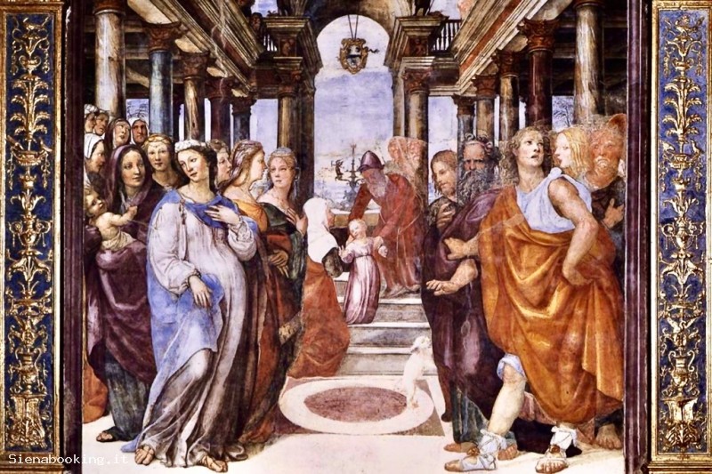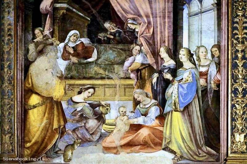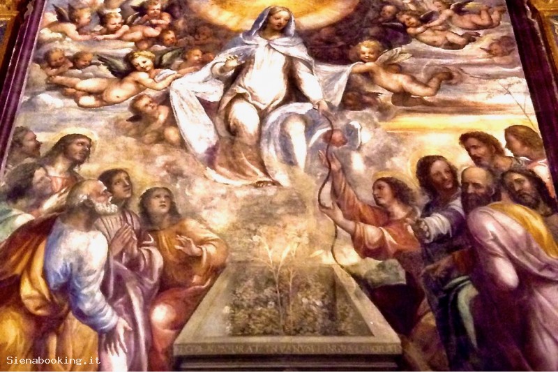 La sala dell'Oratorio Superiore ha un soffitto a cassettoni decorato da teste con cherubini; le pareti sono affrescate con Storie della Vergine del Pacchia, del Sodoma e del Beccafumi.
