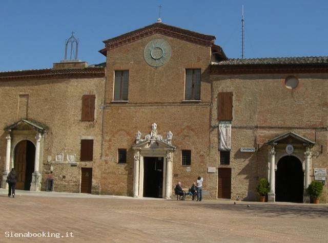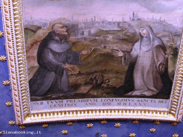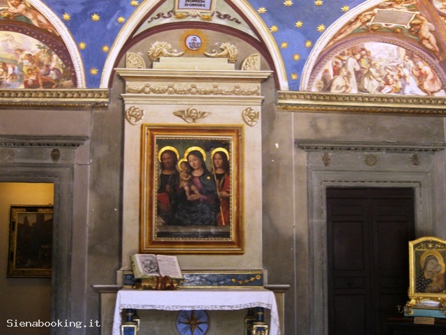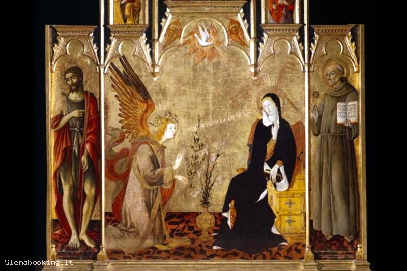 Superstite è la tela che fu collocata sull'altare maggiore nelle ristrutturazioni seicentesche, l' Apparizione della Vergine ai Santi Antonio Abate, Francesco, Caterina da Siena, Bernardino, di Annibale Mazzuoli. La testimonianza più antica è il polittico di Paolo di Giovanni Fei raffigurante la Madonna col Bambino e Santi, databile intorno al 1380.