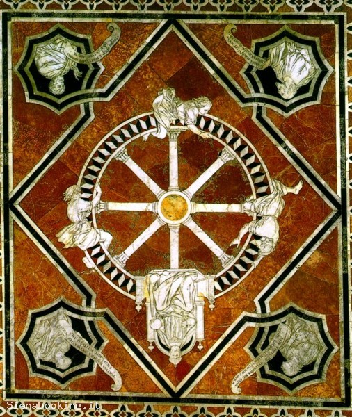 L'ultimo riquadro delle allegorie centrali rappresenta la Ruota della Fortuna, che lo storico senese Tizio ricorda come eseguita nel novembre 1372. La scena, soggetta a intensa usura per la sua posizione, era già stata rifatta nel Settecento (come ricordò Faluschi) e di nuovo venne completamente sostituita nel 1864-1865 da Leopoldo Maccari. Il soggetto si rifà a un tema caro all'arte medievale, spesso rappresentato sulle facciate delle chiese. La ruota rappresenta le vicende umane, ed è raffigurata come un cerchio retto da otto colonne concentriche sulla sommità del quale si trova un re seduto in trono, con tre figure abbracciate alla ruota alle estremità inferiore, destra e sinistra. Il tutto è racchiuso da una cornice mistilinea che disegna una losanga al centro e quattro esagoni agli angoli, nei quali si trova la rappresentazione di quattro filosofi antichi: Epitteto, Aristotele, Euripide e Seneca. Ciascuno di essi impugna un rotolo con iscrizioni legate al tema della Fortuna. La ruota oggi ha un aspetto legato al purismo ottocentesco, che ben si adatta al complesso del pavimento, ma il suo aspetto originale doveva essere più espressivo, simile forse a un'analoga rappresentazione di Domenico di Niccolò nel coro della cappella del Palazzo Pubblico, in cui i personaggi sono più satirici che moraleggianti, legati al motto che indica il mutare della sorte: "regno, regnabo, regnavi, sum sine regno".