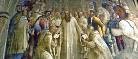 In questa scena ci sono molti personaggi importanti: San Benedetto al centro, accanto a lui la figura del Re di Francia il cui volto è un autoritratto dello stesso Riccio. Poi c’è Leonardo da Vinci e Raffaello con il cappello a destra. Quello dietro San Benedetto è Luca Signorelli mentre quello quello davanti è Lorenzo il Magnifico. Sullo sfondo una veduta di Roma: un arco e i cavalieri che irrompono dando forza alla scena principale. I protagonisti della scena sono due giovani romani, Mauro e Placido, che seguiranno San Benedetto facendosi monaci.