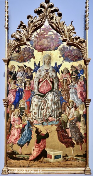 Questa magnifica e imponente visione del corpo e dell'anima della Vergine Maria portati in cielo era il pannello centrale di un grande polittico (una pala d'altare a più pannelli). Fu realizzato per il monastero di Sant'Agostino ad Asciano, nella campagna vicino alla città toscana di Siena.
