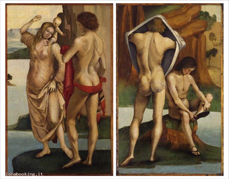 Luca Signorelli, Donna con bambino e un nudi virili, Toledo, Ohio, Toledo Museum of Art, 1488-1489; Queste tavole identificate nel 1913 come due degli scomparti della Pala Bichi. La grande pala era custodita nella omonima cappella chiesa di Sant'Agostino a Siena fino alla seconda metà del XVIII secolo quando fu dispersa e i diversi frammenti giunsero sul mercato internazionale. Oggi, gli scomparti laterali sono nello Staatliche Museen di Berlino, la predella è divisa tra Dublino, Glasgow e Williamstown, mentre questo frammento, insieme al gemello con due figure maschili nude si trova a Toledo (Ohio). Secondo Giorgio Vasari, la pala Bichi fu il motivo dell'interesse di Lorenzo de' Medici nei confronti di Signorelli e la ragione per la quale il pittore acquisì “grandi ricchezze ed onore”. La pala venne realizzata tra il 1488 e il 1489. Secondo una descrizione del XVIII secolo questi due frammenti formavano lo scomparto centrale della pala davanti al quale era una statua policroma di San Cristoforo. Le figure rappresentano “testimoni” dell'attraversamento delle acque di San Cristoforo con il Cristo bambino sulle spalle, pronti anche loro ad immergersi; in maniera particolare la donna che ha appena messo sulle spalle un bambino e si accinge ad alzare la veste per scoprire le gambe ed entrare nell'acqua. Soltanto Van Marle nel 1937 si dichiarò contrario a questa lettura della tavola che venne da lui interpretata come facente parte di un Battesimo. Olio su tavola, cm. 67,9 x 41,9