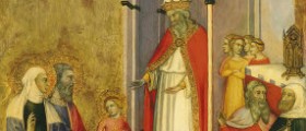 Terzo Pannello della Predella sulla vita di Maria, (fascia dipinta divisa in più riquadri che faceva da corredo alle pale d'altare, dove vengono narrati in sequenza degli eventi). Il pannello mostra la giovane Vergine che entra nello stesso portico del Tempio dove viene accolta dallo stesso Prete che un tempo allontanò i suoi genitori dal luogo di culto perché considerati indegni. La continuità da realismo alla scena malgrado nonostante l’oro sullo sfondo.