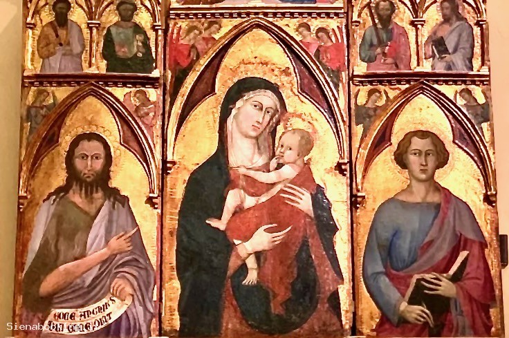 Pala a trittico mancante delle decorazioni della cornice, immagini incorniciate da finestra ogivale triloba con angeli affacciati ai lati. Madonna con Bambino, san Giovanni Battista, san Giovanni Evangelista, angeli e santi, storie della vita della Madonna