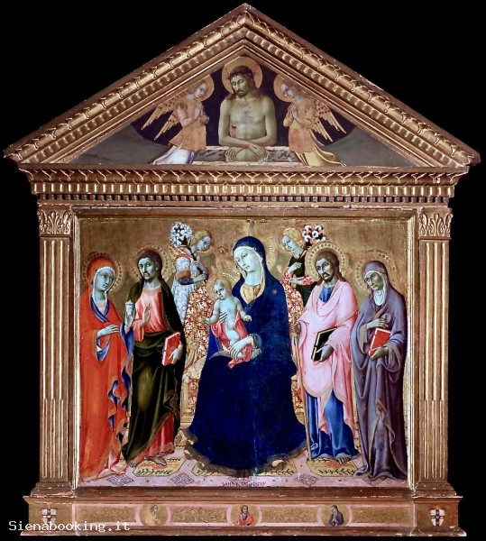 Il grande dipinto realizzato su unica suprfice e parte superiore a tempietto, rassomiglia come struttura esterna alla vicina Assunzione della Madonna del Vecchietta che si trova nel Duomo.