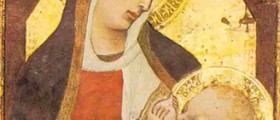 La “Madonna del latte”, dipinta su tavola dal pittore senese Ambrogio Lorenzetti nel 1340 circa, è venerata come protettrice del Seminario “Pio XII” di Siena. L’opera, proveniente dalla residenza estiva del seminario, presso il monastero di Lecceto, venne trasferita nel 1866 nel seminario, ubicato all’epoca nel complesso conventuale di San Francesco, e successivamente (1953) venne collocata nella cappella della nuova sede del seminario, in località Montarioso. In anni recenti è stata trasportata ed esposta al Museo Diocesano, in considerazione del suo prezioso valore artistico. Nel dipinto, infatti, si riconosce l’innovativa ricerca pittorica di Ambrogio Lorenzetti che predilige il carattere naturalistico della rappresentazione con cui presenta aspetti concreti della vita umana e della società del suo tempo. A differenza delle precedenti tavole trecentesche e quelle di tradizione bizantina, Maria non ha una posizione centrale dominante, è spostata verso sinistra per dare più spazio e importanza al vivace Gesù bambino e far risaltare il loro affettuoso rapporto. E’ proprio questo loro legame ha costituire il protagonista del dipinto che potremmo definire, con le parole di Chiara Frugoni: un “amore materno filtrato da una soffusa malinconia”. La Vergine Madre sostiene con mani poderose e con una presa sicura il dinamico bambino che scalcia con movimento naturalissimo e reclina verso di lui il volto sereno per osservarlo mentre si allatta, succhiando con avidità infantile, dal seno su cui poggia le manine. Le due figure, grazie a questa stretta correlazione dei gesti, si integrano armonicamente tanto da formare un unico gruppo; tale interazione è sottolineata dal gioco dei colori: sull’intenso blu del manto che avvolge la Vergine spicca il cangiante rosa del panneggiato e ricamato tessuto da cui fuoriesce il tenero corpo di Gesù. La monumentalità del gruppo è resa più evidente dalla realizzazione di un bordo violaceo, che delimita il fondo d’oro, e oltre il quale le figure sono dipinte tanto da sembrare che si affacciano dalla cornice lignea.