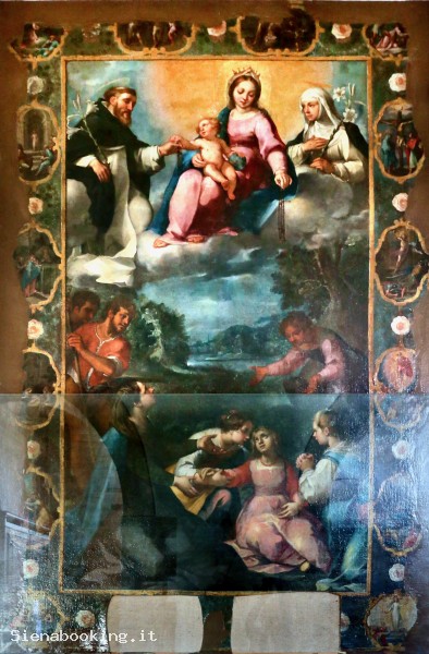L'ideazione dell'opera si deve a Francesco Vanni; a conferma di questo sta il disegno del British Museum di Londra (inv. n. 1895. 9. 15. 586), confrontabile con quello del Manetti di stesso soggetto (British Museum, inv. n. 1583. 8. 13.28), che rappresenta una fase di elaborazione posteriore e più prossima, quindi, al dipinto, e ne consolida l'attribuzione a questo pittore. La datazione si evince dal confronto con opere datate del Manetti (es. "Martino V in processione con la statua di san Rocco" Siena, chiesa di S. Rocco, firmato e datato al 1610). Per ciò che concerne l'iscrizione, il Naldi la interpreta come firma, mentre va più probabilmente considerata come un indirizzo scritto dal fornitore del Vanni o forse dalla compagnia del Rosario, committente dell'opera, che potrebbe aver acquistato direttamente la tela