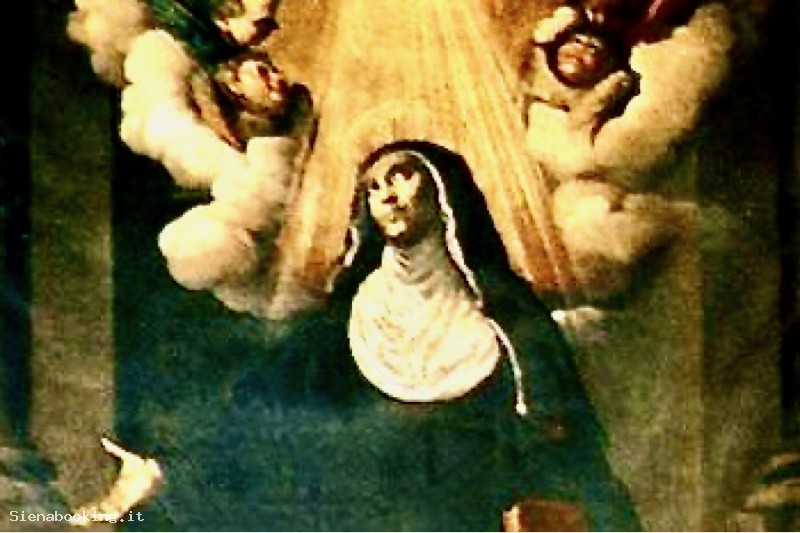 Olio su tela, 240x140 cm. La tela, attualmente posta sul secondo altare di destra della chie¬sa, sembra costituire un'importante testimonianza della collabora¬zione tra Rutilio ed il giovane figlio Domenico nel momento in cui l'anziano pittore rinsalda, probabilmente a contatto con esempi del Barburen, con nuovo vigore l'adesione ai modelli naturali, alla cruda verità ottica dei modelli caravaggeschi, espressa del resto a pieno nella tela eseguita, in anni non lontani da questa Santa Monica, per un'altra chiesa ascianese, quella di San Francesco. Descrizione a cura di Cecilia Alessi (1994).